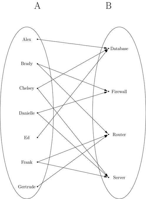 Something else we could do to visualize a relation is by directly drawing arrows between related elements. The basic idea here is that for a relation $\mathcal{R} \subseteq A \times B$, we list the elements of A and the elements of B with some space in between. (The lists could be vertical or horizontal.) Next, for each element $a_i$ in A, we draw an arrow from $a_i$ to an element $b_j$ in B if $a_i$ is related to $b_j$.